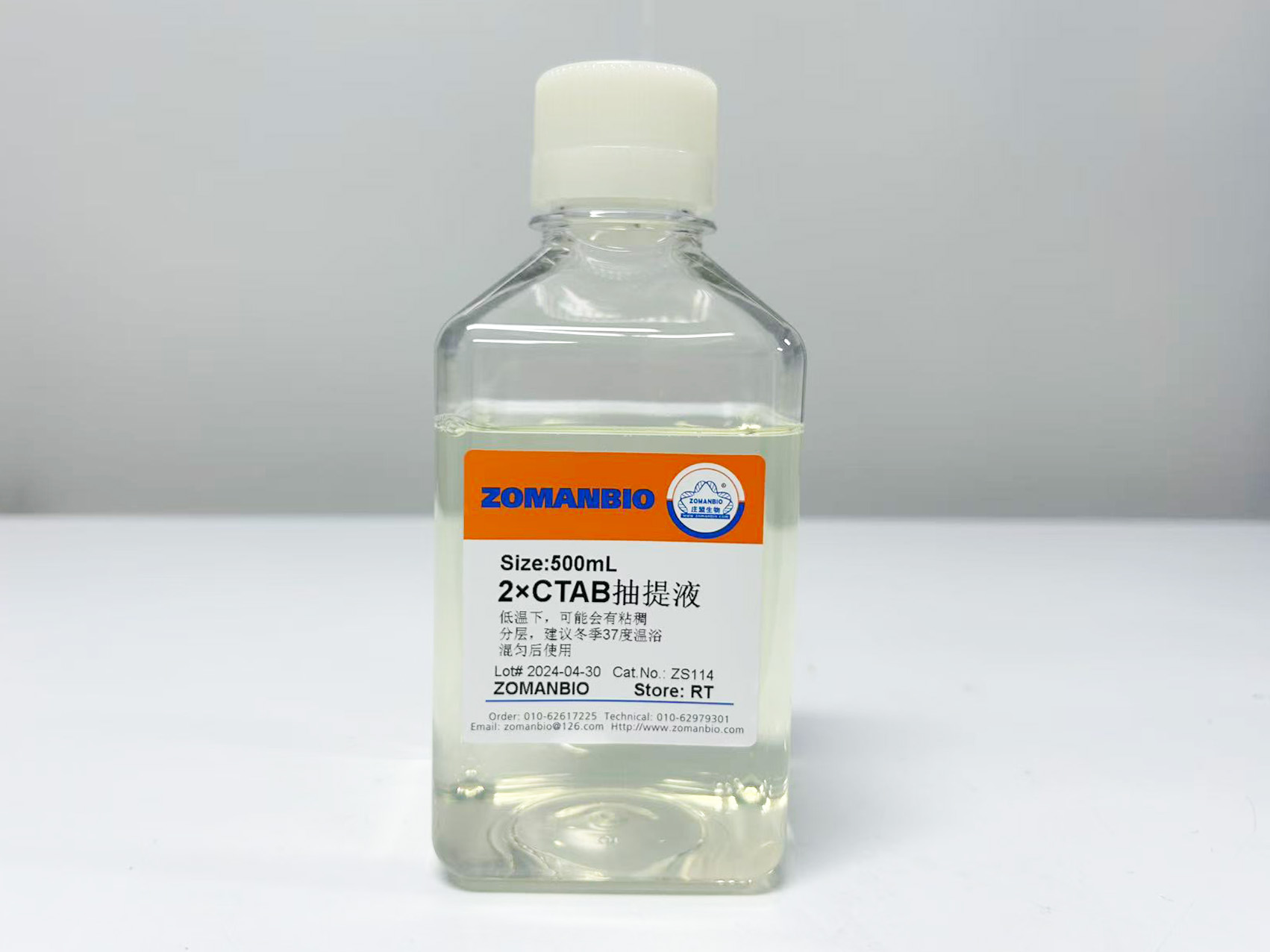 CTAB(hexadecyltrimethylammonium bromide,十六烷基三甲基溴化銨),是一種陽(yáng)離子去污劑,具有從低離子強(qiáng)度溶液中沉淀核酸與酸性多聚糖的特性。在高離子強(qiáng)度的溶液中(0.7mol/L NaCl),CTAB與蛋白質(zhì)和多聚糖形成復(fù)合物,只是不能沉淀核酸.通過(guò)有機(jī)溶劑抽提,去除蛋白、多糖、酚類(lèi)等雜質(zhì)后加入異丙醇沉淀即可使核酸分離出來(lái)。本抽提液含有多酚吸附劑,對(duì)于水稻,小麥,玉米等常見(jiàn)植物,多酚物質(zhì)不太多的樣品,完全可以不用添加β巰基乙醇。