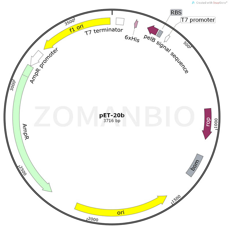 pET-20b質(zhì)粒是一個(gè)大腸桿菌蛋白表達(dá)載體,T7啟動(dòng)子驅(qū)動(dòng)目的基因和6×HIS標(biāo)簽融合表達(dá),并在pelB信號(hào)肽的作用下分泌至細(xì)胞周質(zhì)。The pET-20b vector carries an N-terminal pelB signal sequence for potential periplasmic localization, plus optional C-terminal His?Tag? sequence. Unique sites are shown on the circle map. Note that the sequence is numbered by the pBR322 convention, so the T7 expression region is reversed on the circular map. The cloning/expression region of the coding strand transcribed by T7 RNA polymerase is shown below. The f1 origin is oriented so that infection with helper phage will produce virions containing single-stranded DNA that corresponds to the coding strand. Therefore, single-stranded sequencing should be performed using the T7 terminator primer.質(zhì)粒只保證關(guān)鍵序列正確,不保證表達(dá)效果。