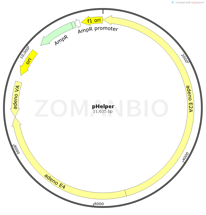This 11.6 KB vector carries the adenovirus genes (E2A E4 and VA RNAs required inducing the lytic) for phase of AAV. This vector is cotransfected into the packaging cell line to produce recombinant replication-deficient AAV virions., it is related to packaging adenovirus vector with ampicillin resistance.