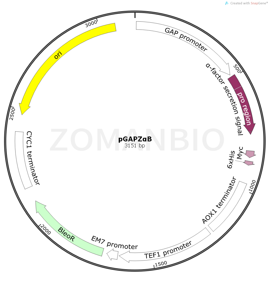 pGAPZ A,B,和C載體(2.9 KB)和pGAPZαB和C(3.1 KB)載體使用GAP啟動子在畢赤酵母中穩(wěn)定表達(dá)重組蛋白。重組蛋白表達(dá)為為帶有C-末端myc抗原表位和C端His標(biāo)簽的融合蛋白。此外,pGAPZα 表達(dá)的融合蛋白在N-端帶有釀酒酵母(Saccharomyces cerevisiae)的α-因子分泌信號肽。這兩個系列的載體都提供三個不同讀碼框的載體,以方便克隆的帶有C-端標(biāo)簽和/或N-末端分泌信號肽的載體中。