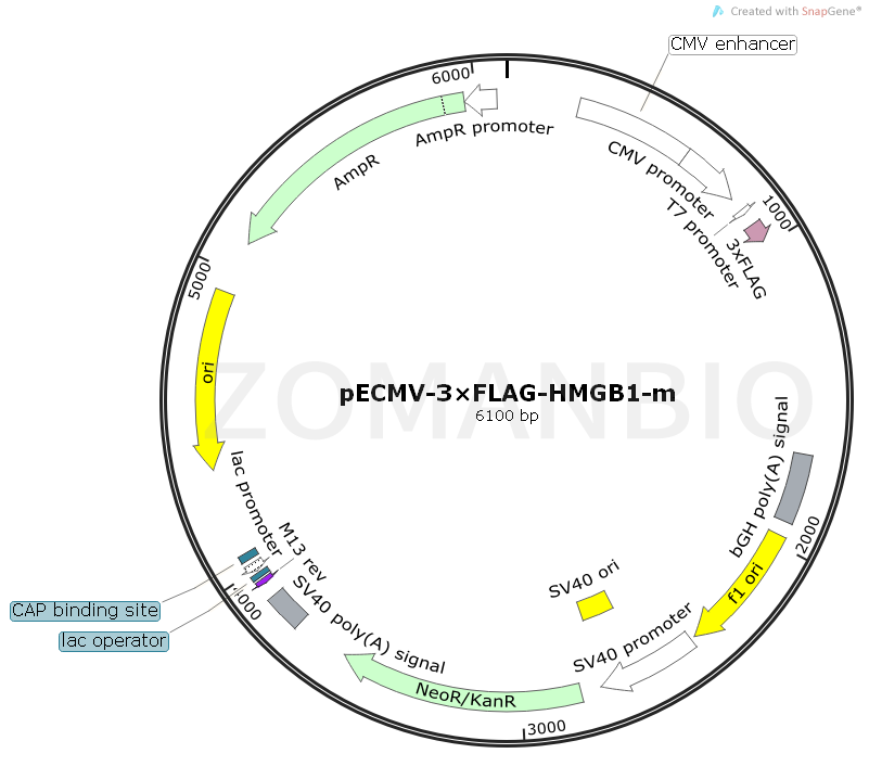 pECMV-3×FLAG-HMGB1-m質(zhì)粒是在pECMV-3×FLAG載體的基礎上改造而成,CMV啟動小鼠源HMGB1基因的過表達,N端的3×FLAG融合標簽能很好的被FLAG抗體識別。該質(zhì)??勺鳛檫^表達質(zhì)粒直接轉(zhuǎn)染哺乳細胞。質(zhì)粒本身帶有Neo篩選標記,可用G418篩選轉(zhuǎn)染后的細胞得到穩(wěn)轉(zhuǎn)細胞系。
